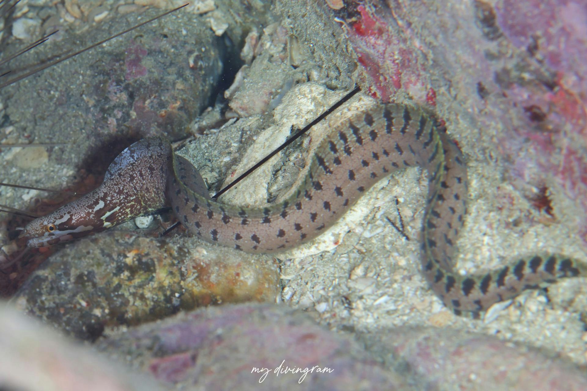 このウツボも臆病らしく、ヒレオビウツボが出ているときはホムラハゼも出るよと教えてもらったのですが、臆病どころか途中で穴の中を徘徊しはじめる始末。