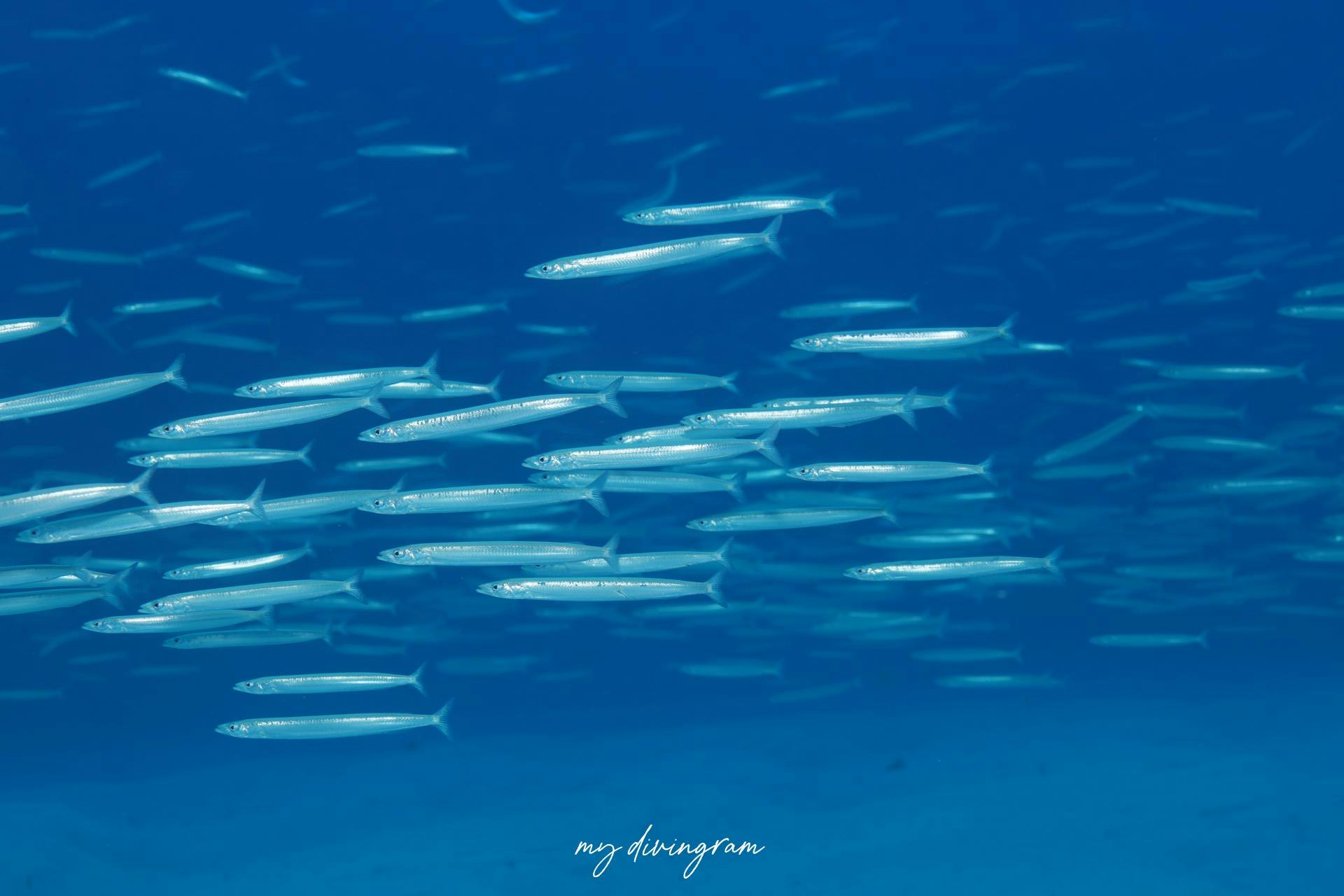 小笠原諸島の固有種で、例年GWあたりに閂の砂地でミナミイカナゴの幼魚が大きな群れを作り、イケカツオなんかが突っ込む様子が観察できます。