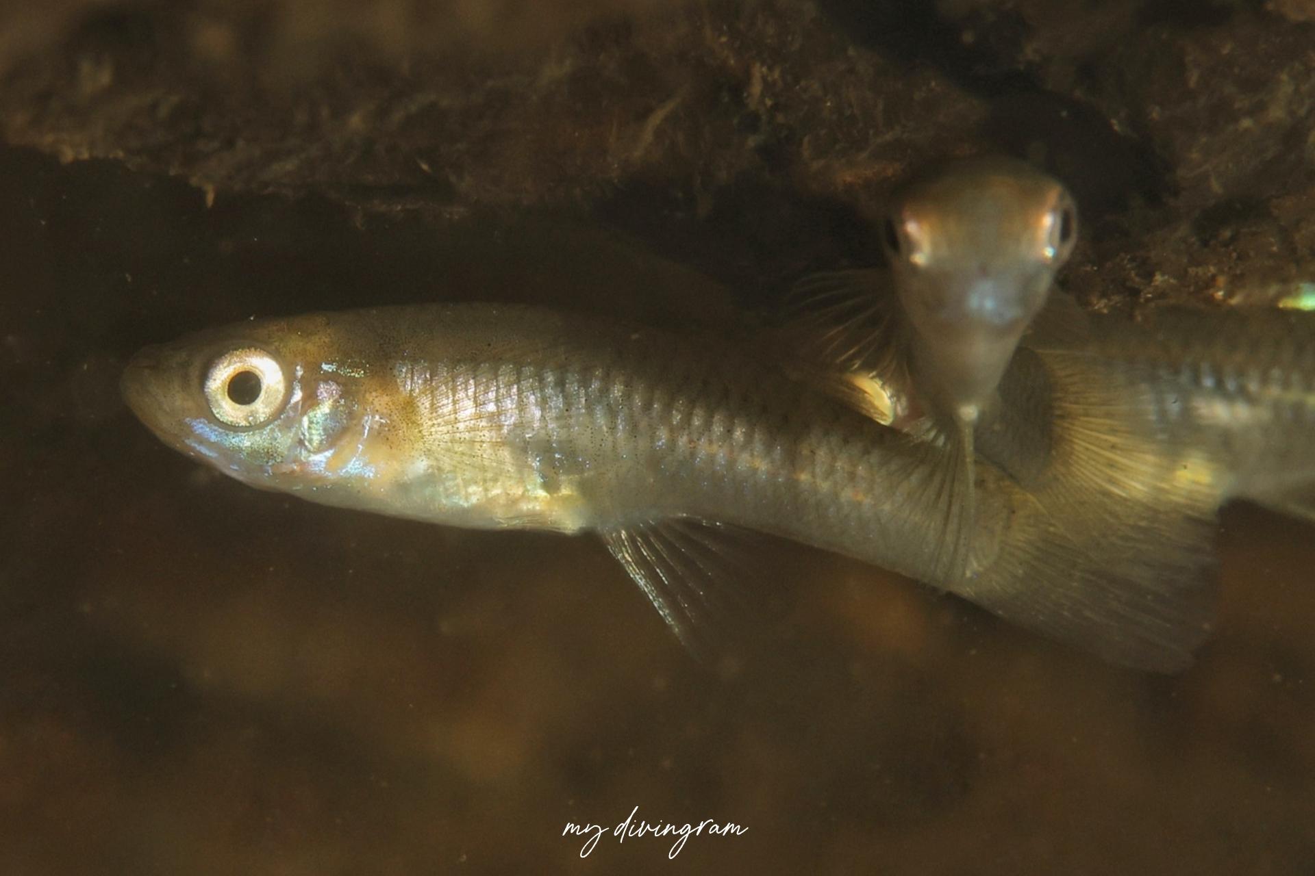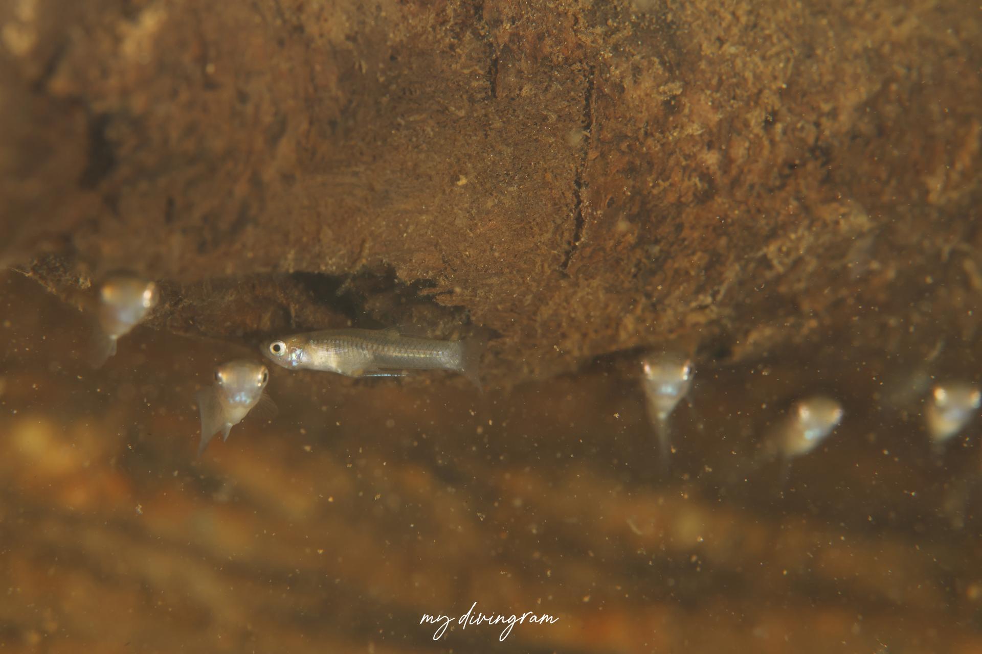 一見、メダカに似ていますが全然別のグループで、尾鰭が丸いことや、背鰭・臀鰭の位置がより前方なこと、臀鰭の基底が短いことで見分けることができます。