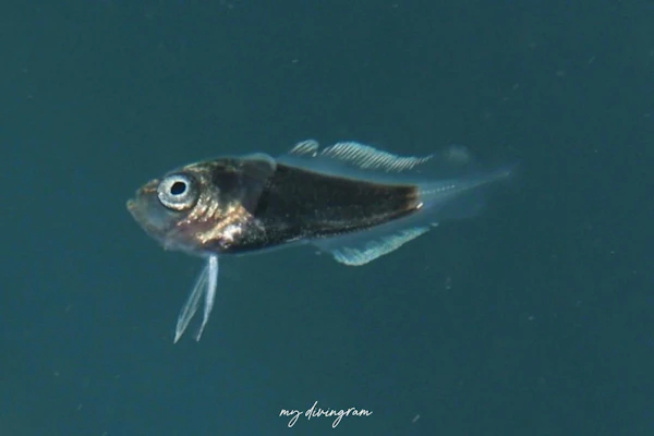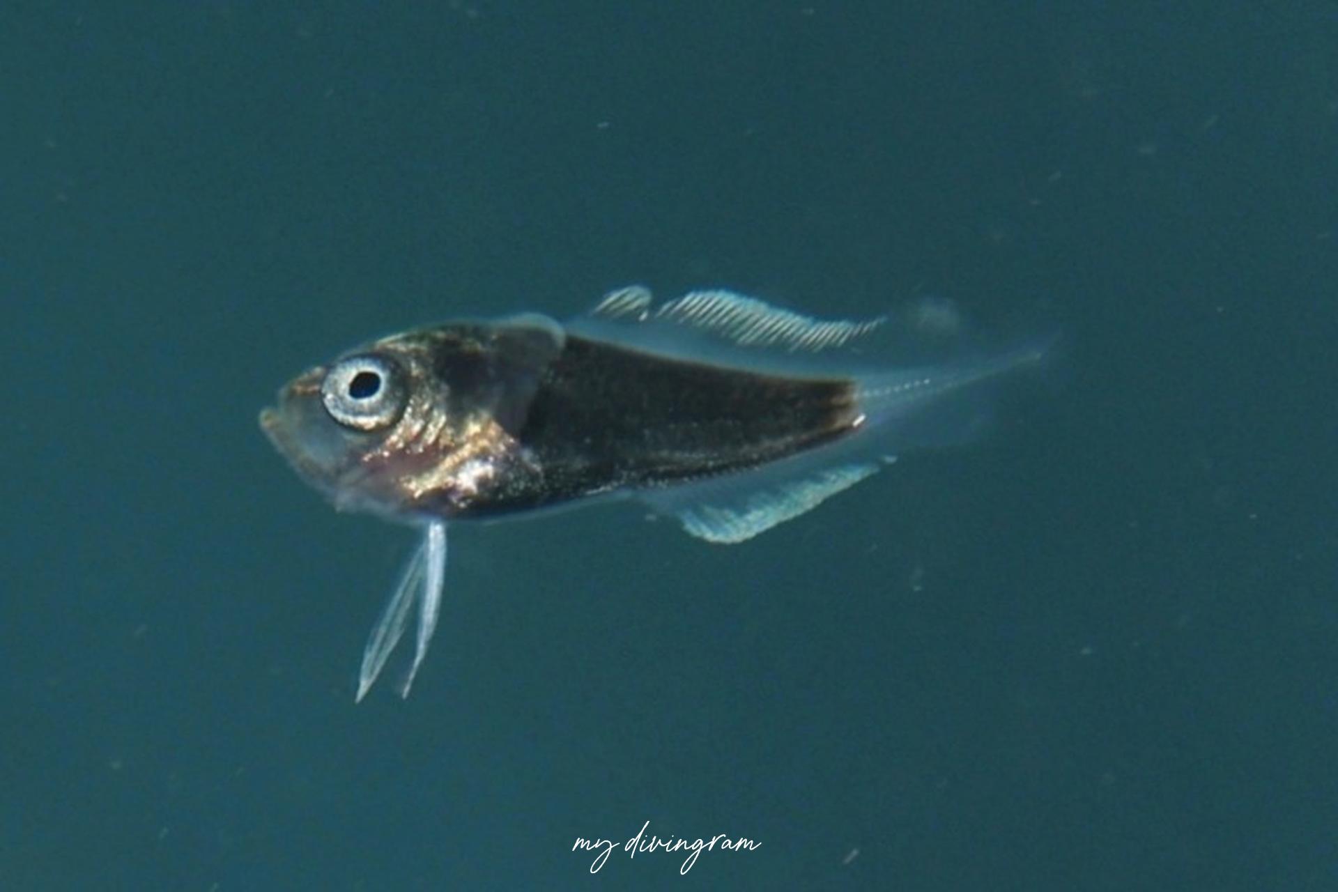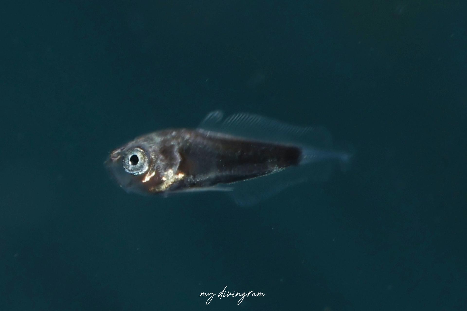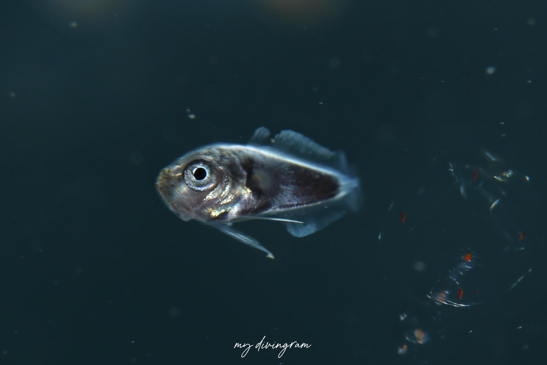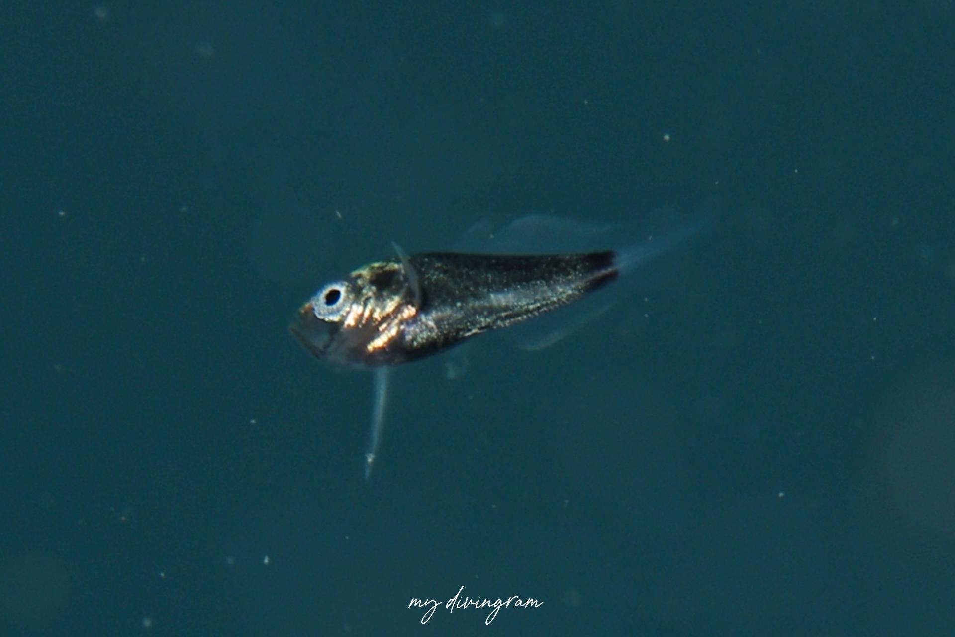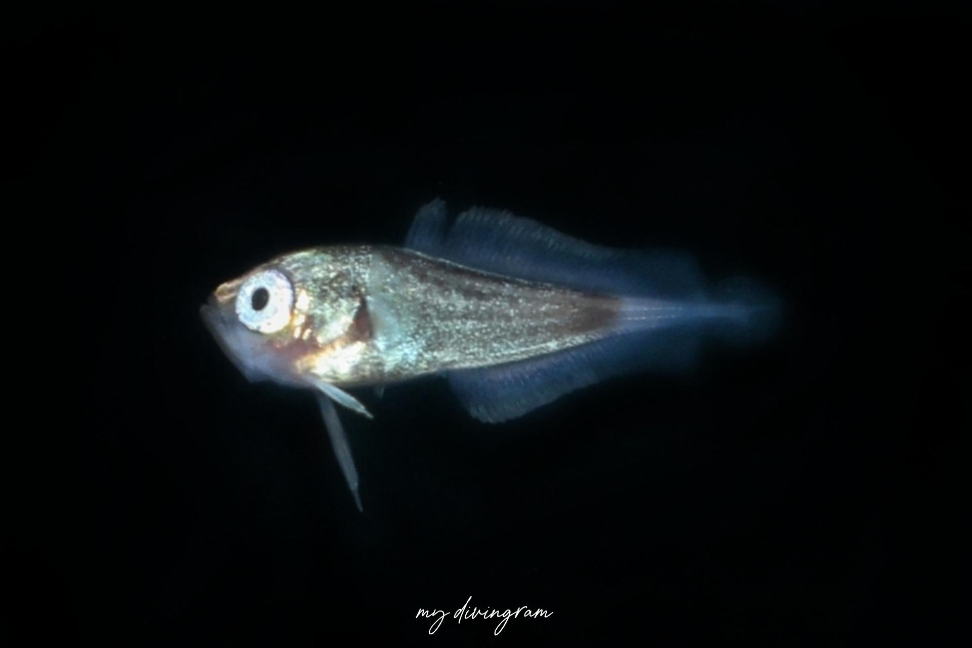 下顎にヒゲがないことと黒色素胞の配置からイトヒキダラの稚魚に同定していただきました。