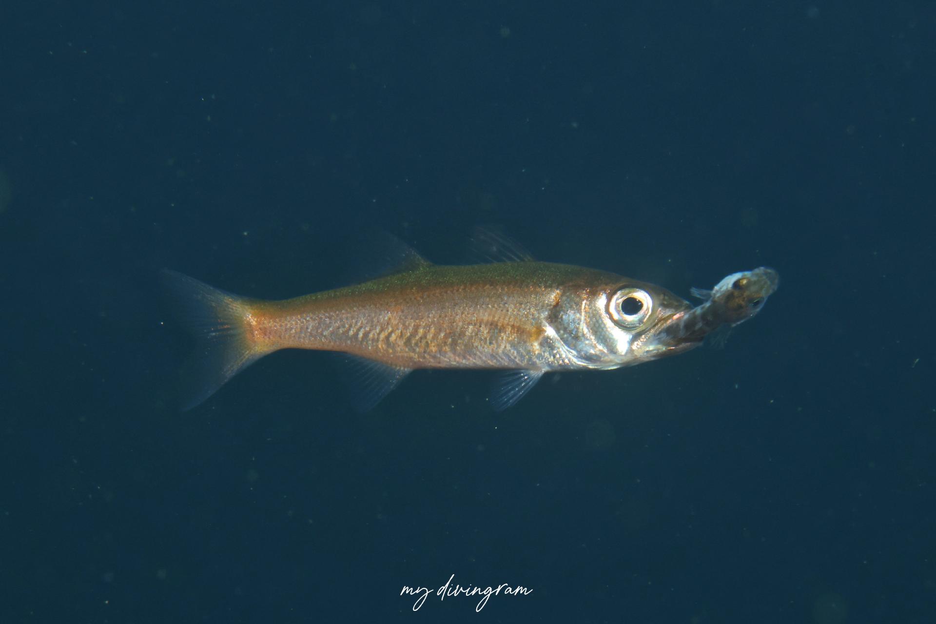 ムツの幼魚が何か咥えていると思ったらメバルの幼魚を捕食していました。一緒に群れてるのにお弁当だったのね…