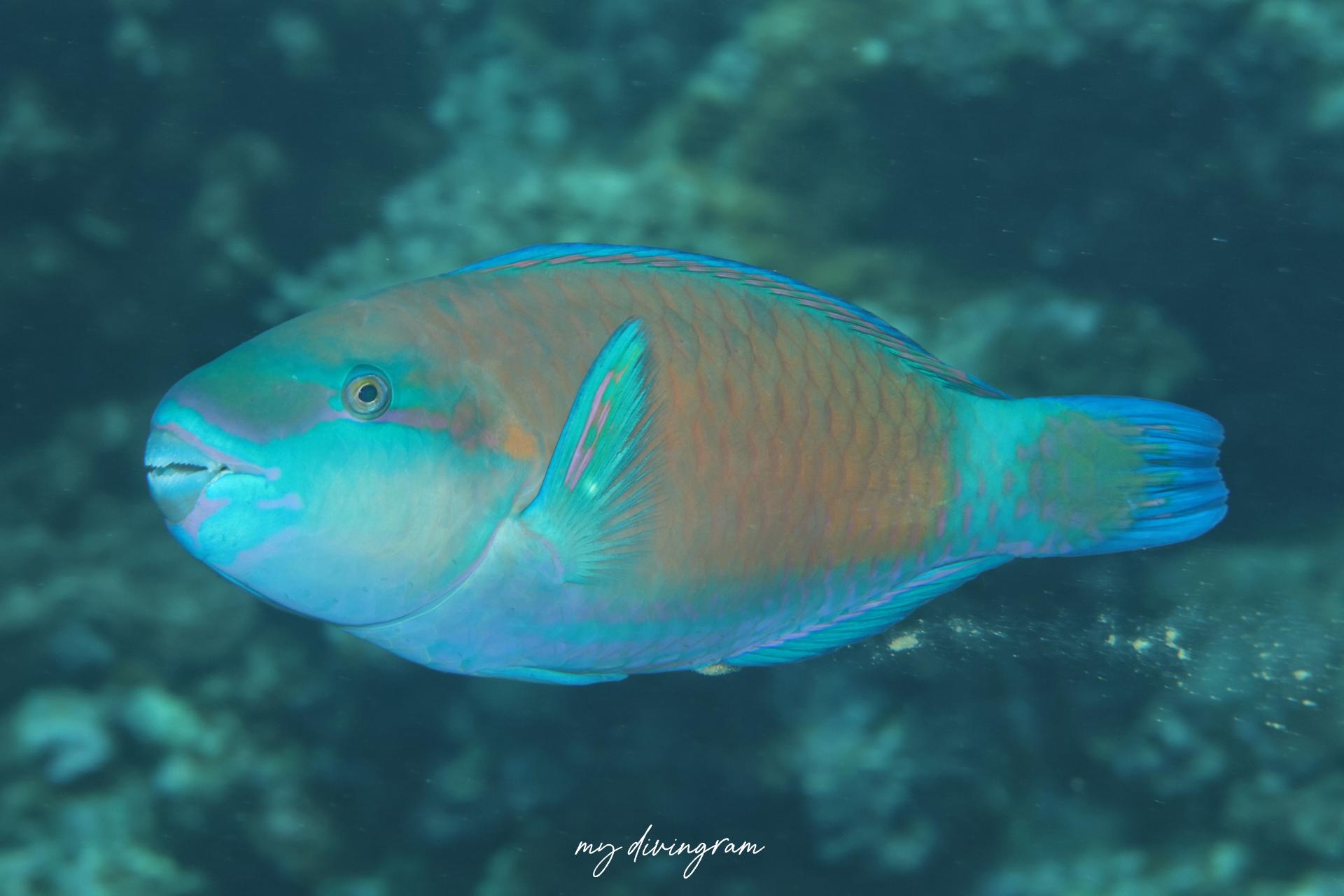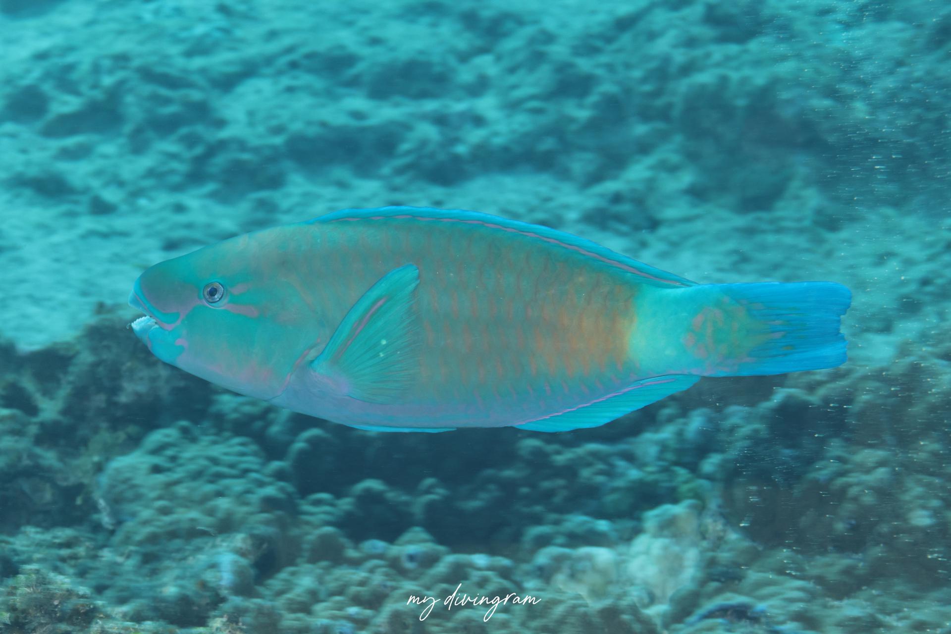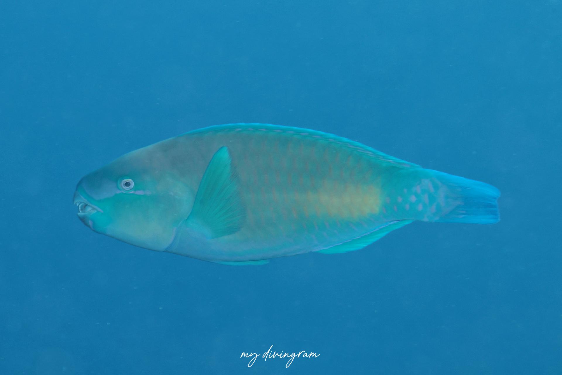 幼魚はかすんだストライプ模様で、メスと同じく尾柄部に黒斑があります。