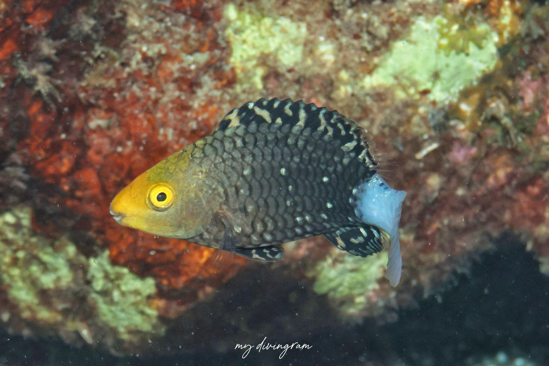 幼魚はニシキブダイによく似ていますが、顔先が黄色いことと生息環境や生息域で容易に見分けられるそうです。