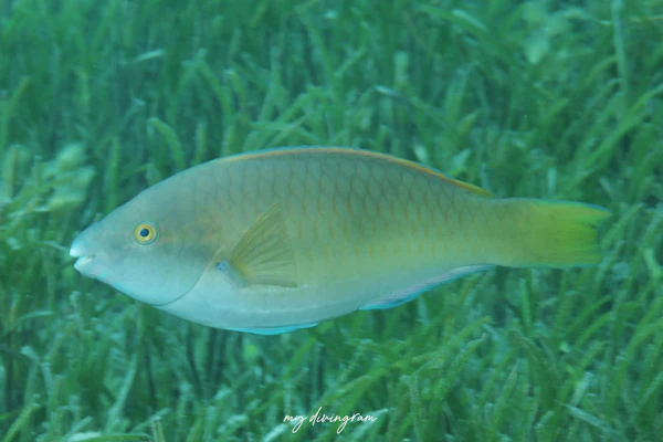 メスは全身がうぐいす色で地味で、腹部に2,3本の白いラインが入ることでスジブダイのメスと似ていますが、虹彩と胸鰭の基底が鮮やかな黄色なことで見分けられます。