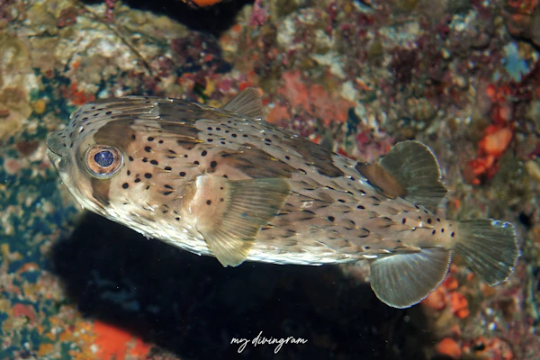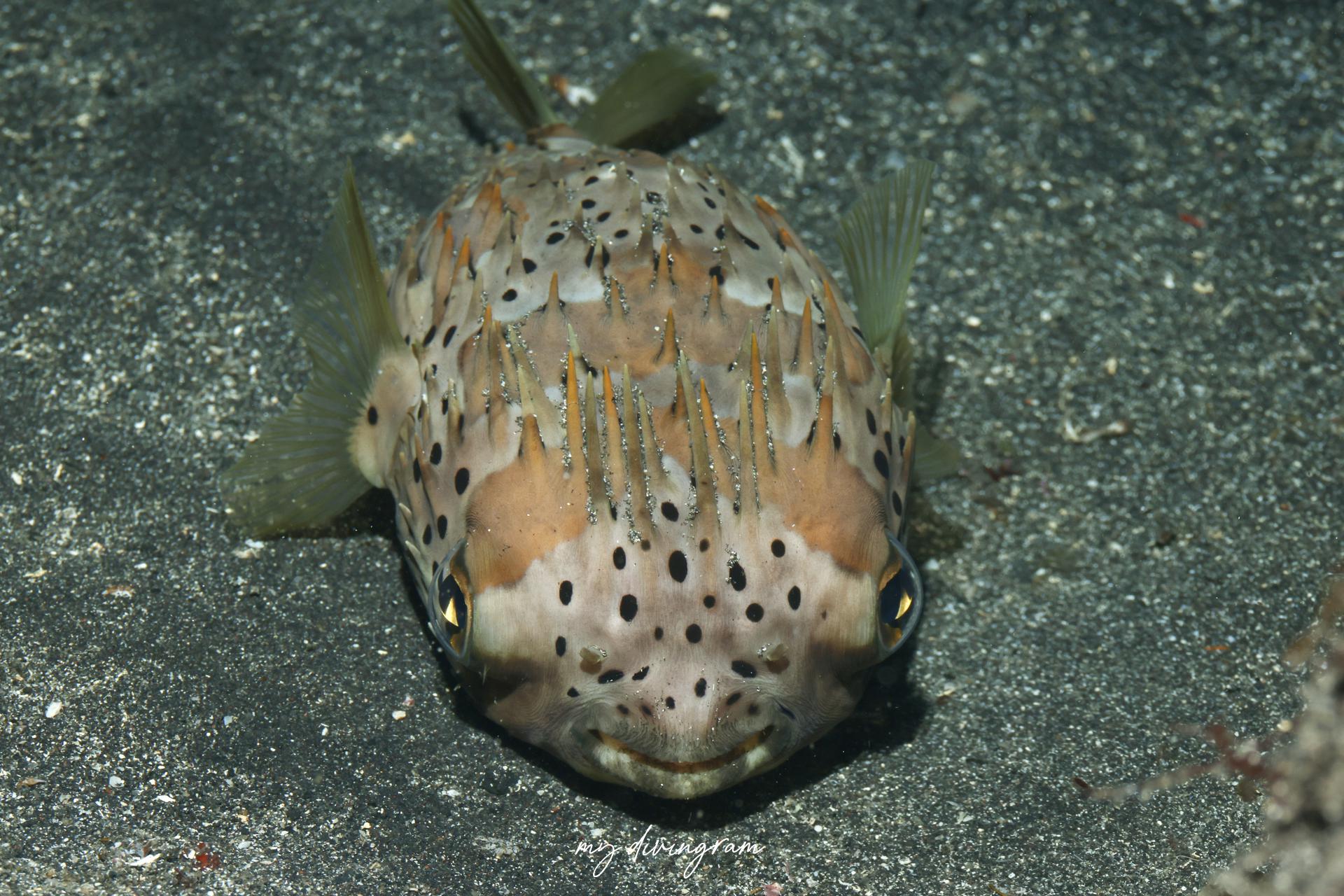 ヒトヅラハリセンボンによく似ていますが体の黒斑に白い縁取りがないことで見分けられます。
