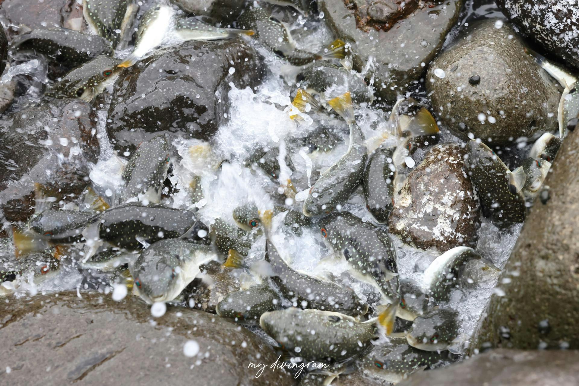 16時ごろ、クサフグたちが一斉に岸に上がってきます。