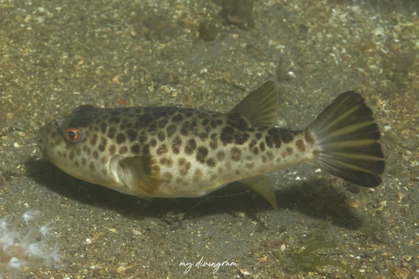 初めて見たヒガンフグ、ちゃんと撮ろうと思ってたら後輩に手で追い払われてナイトダイビングの闇の中に消えていってとても悲しい思いをしましたまる。