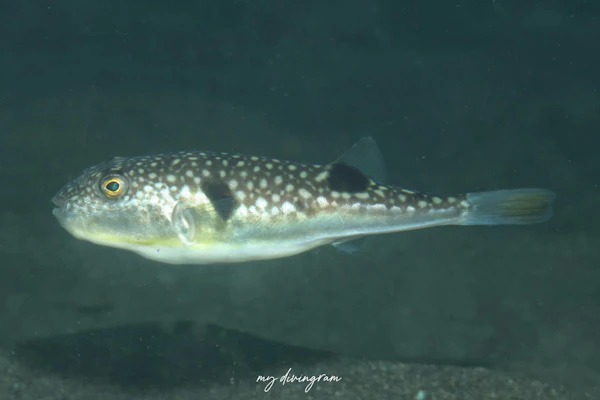 ナシフグによく似ていますが、胸鰭後方の暗色斑が白く縁取られないことで見分けられます。