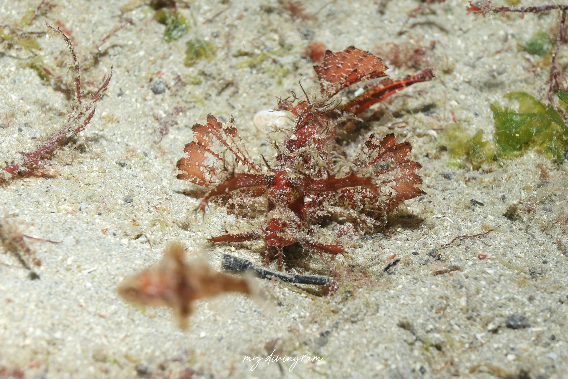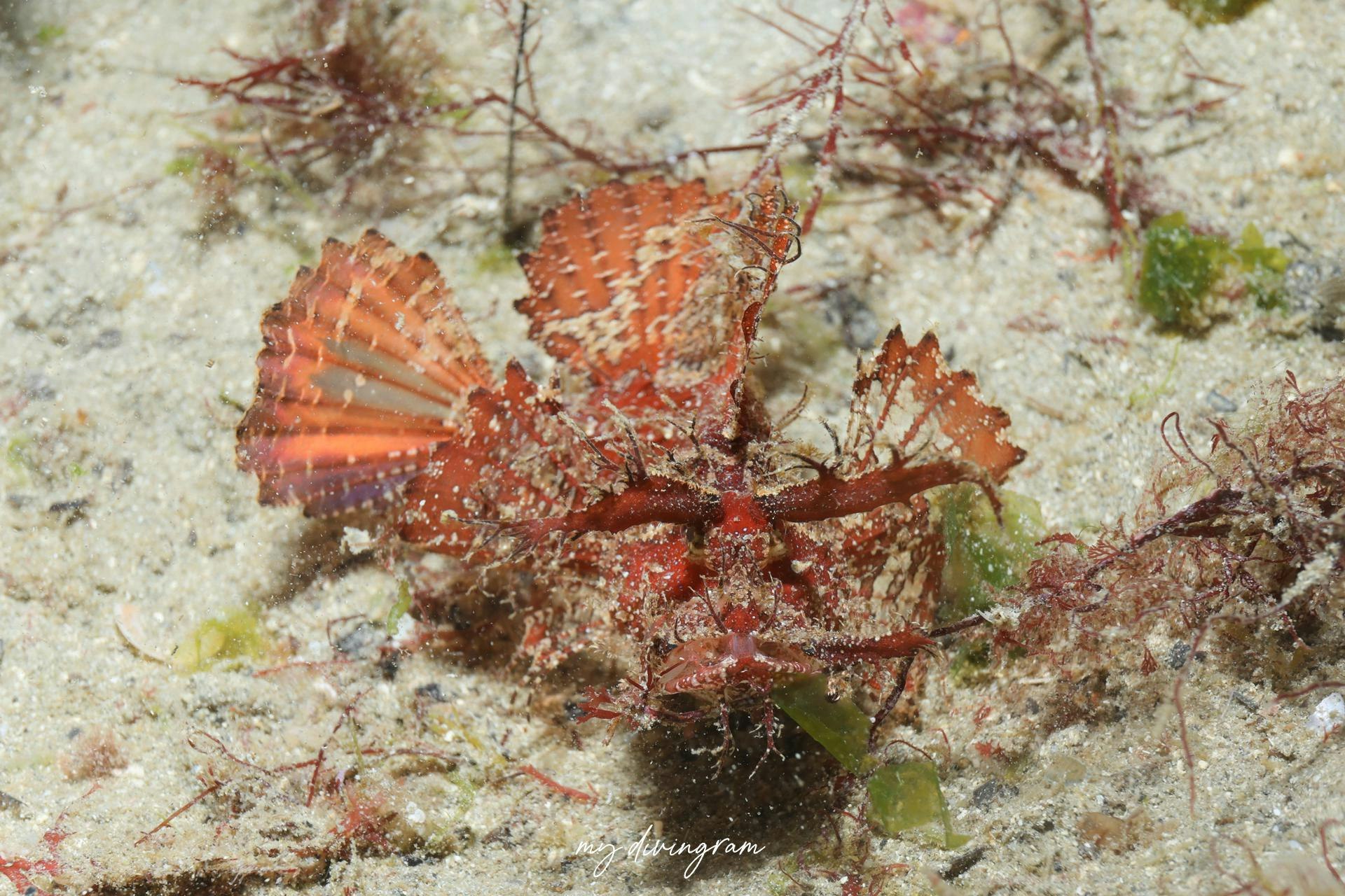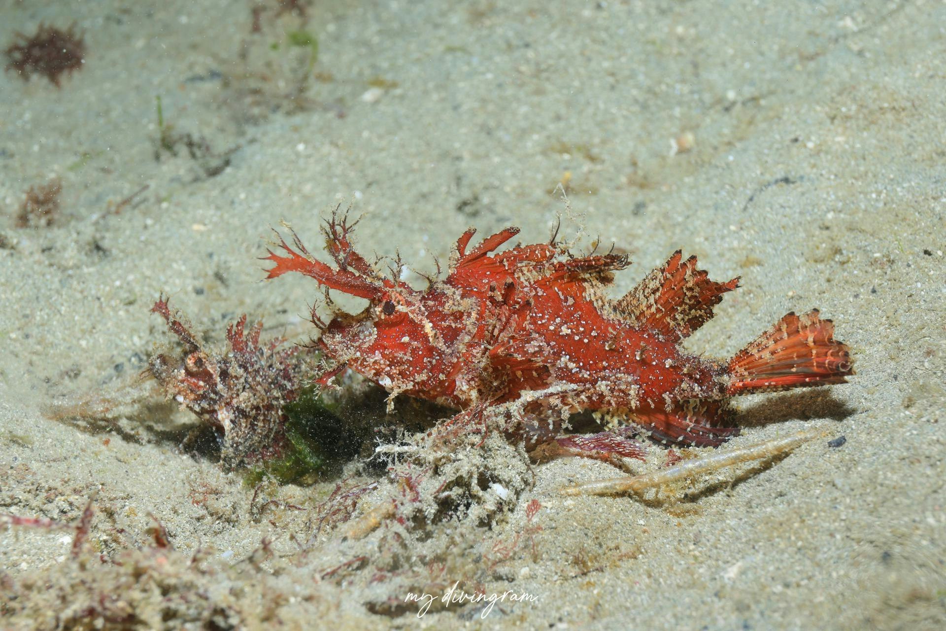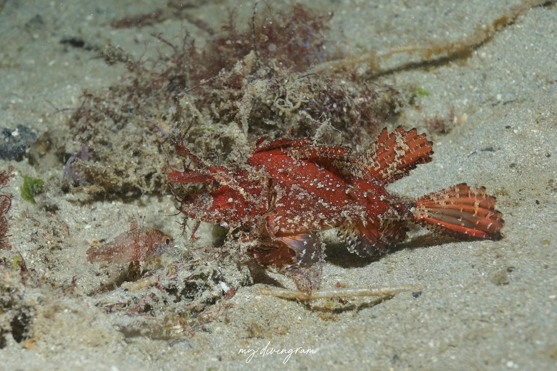 かつて大瀬崎で見た個体はツルツルで綺麗な赤色だったのでこのイメージだったのですが、ツノカサゴが多く生息しているアニラオでは2周りくらい小さくてもじゃもじゃで茶色でした。