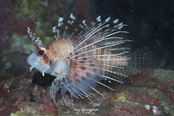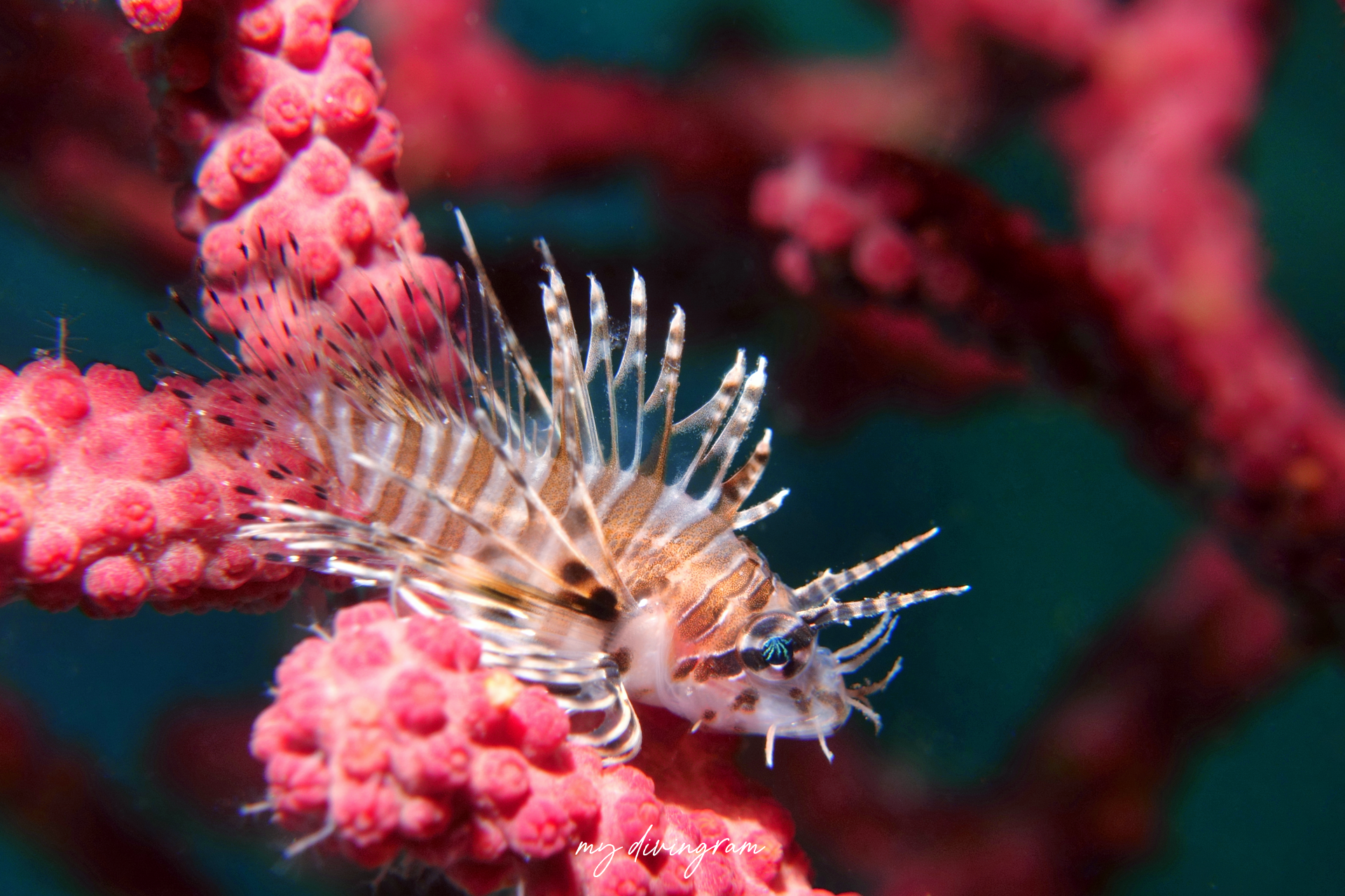 ネッタイミノカサゴと酷似していますが、胸鰭軟条が紅白の縞模様なのが一番の特徴です。