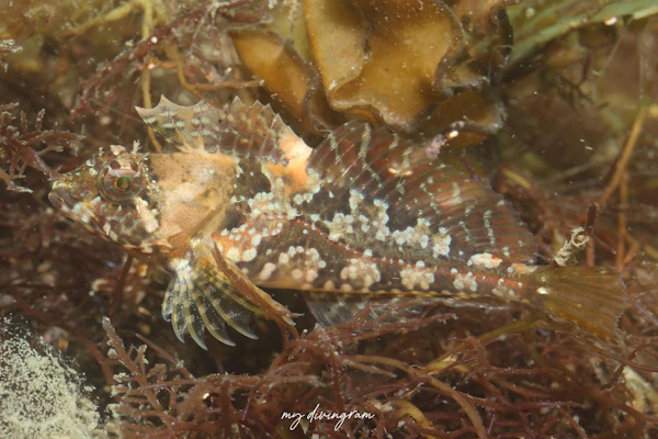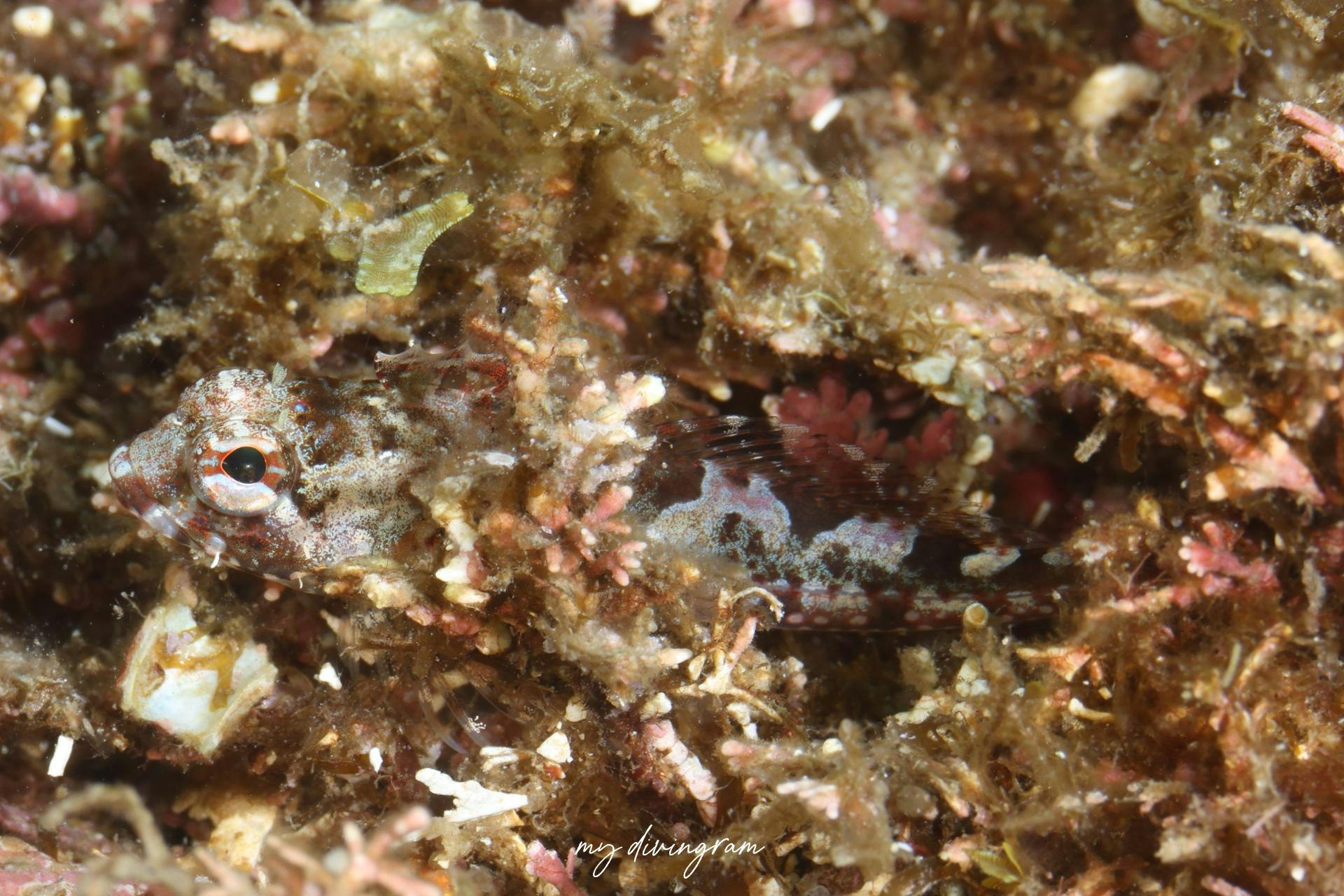 情報量少なめで困ってたのですが、眼の模様と第2背鰭の斜帯からサラサカジカの可能性があるとご指摘いただきました。