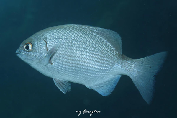 他のイスズミの仲間の幼魚と見分けるのが難しいですが、体の中央に白色斑が帯状に並ぶことが特徴です。