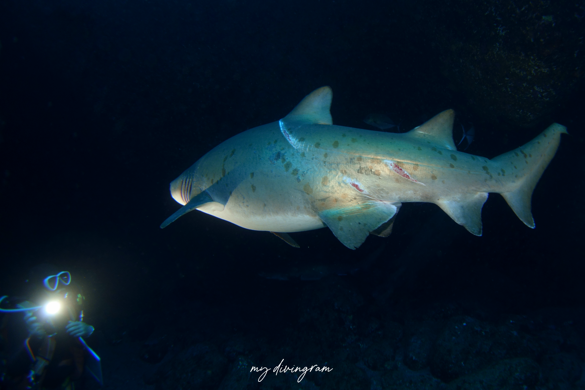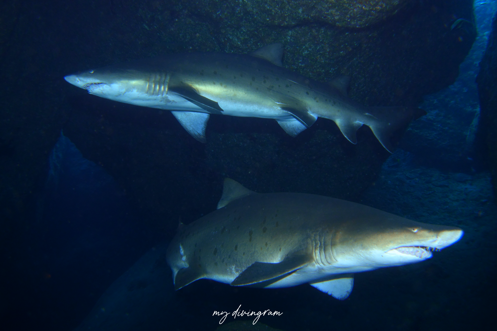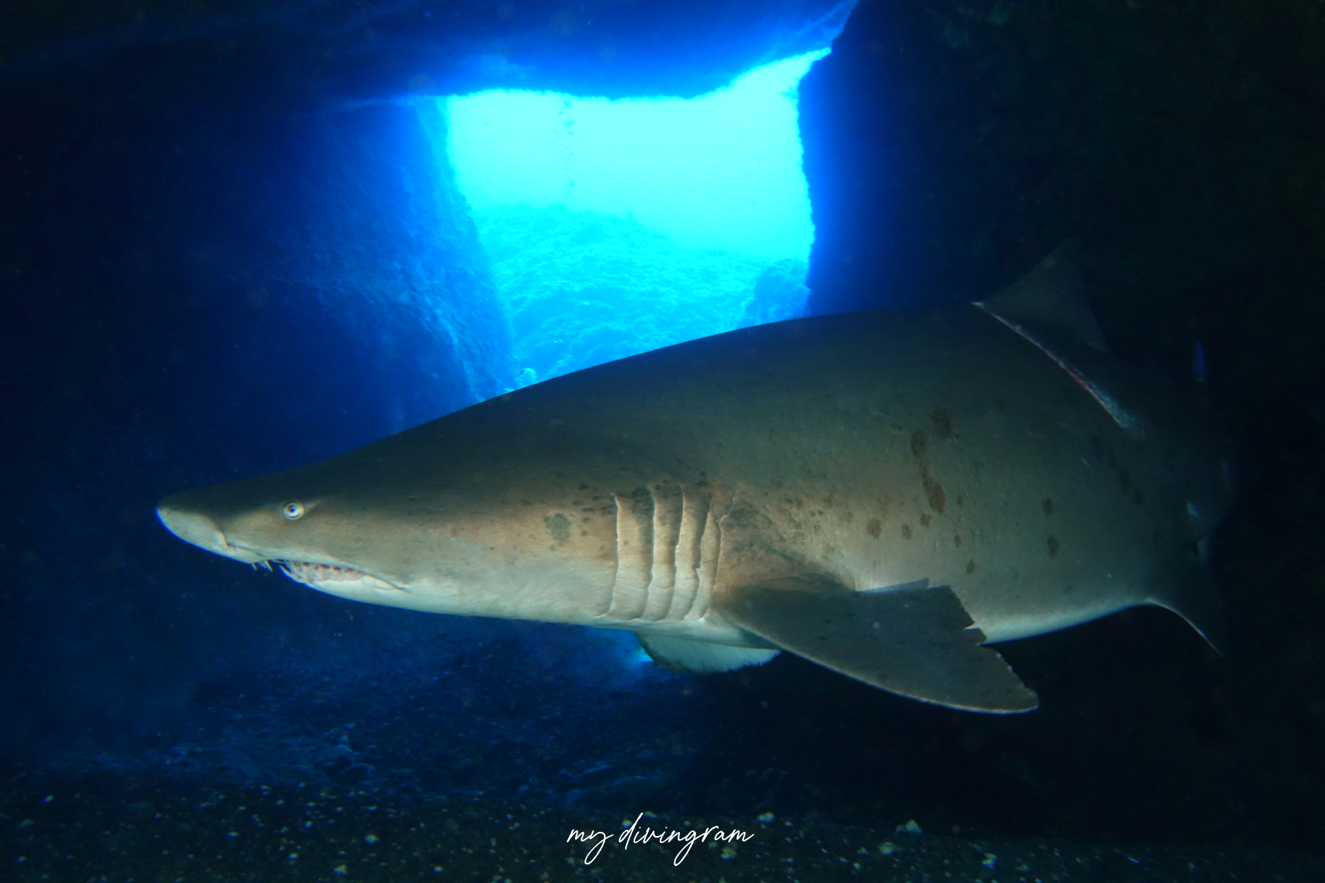 こちらは鹿浜のシロワニ。奥が暗い洞窟です。