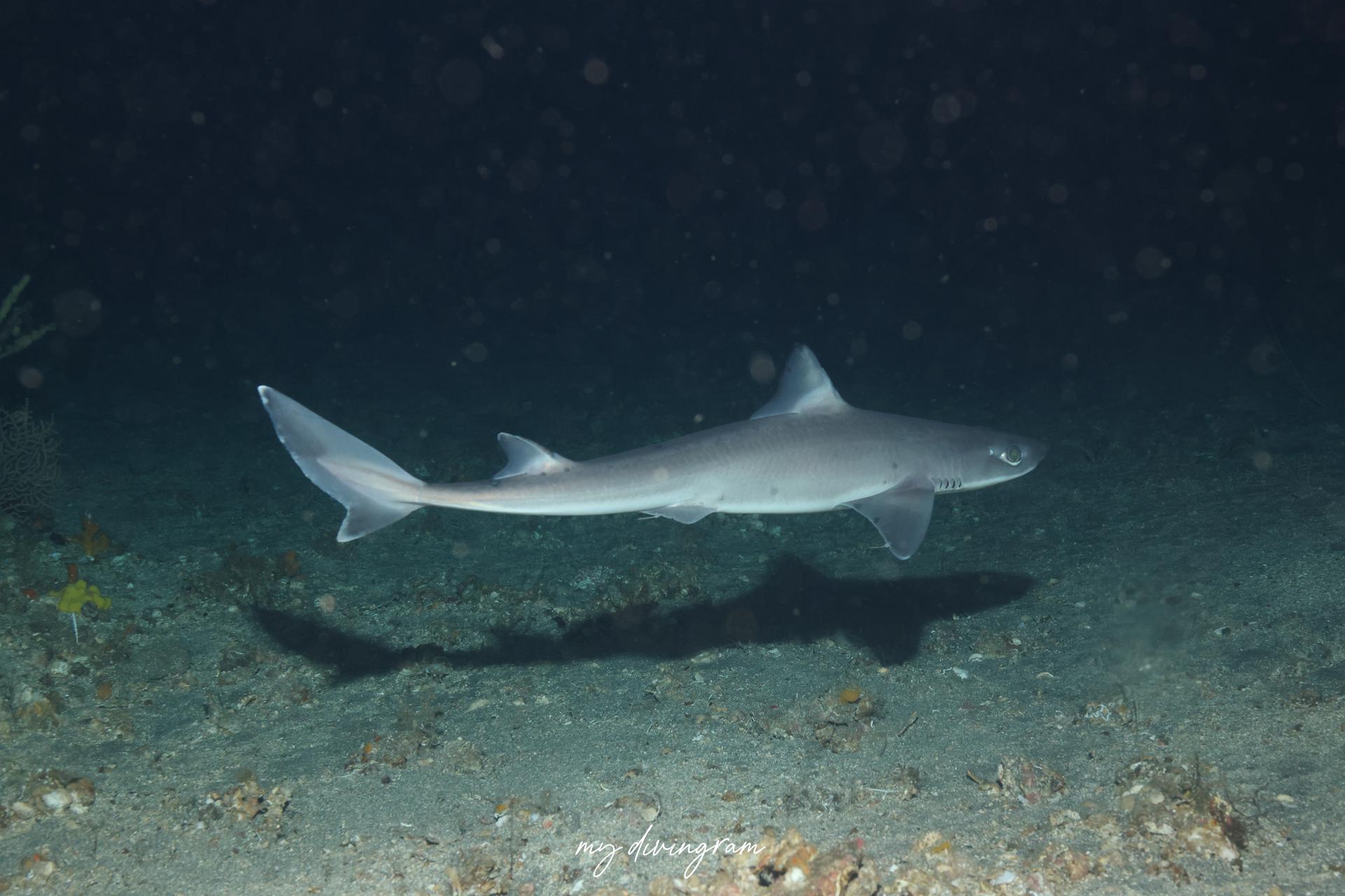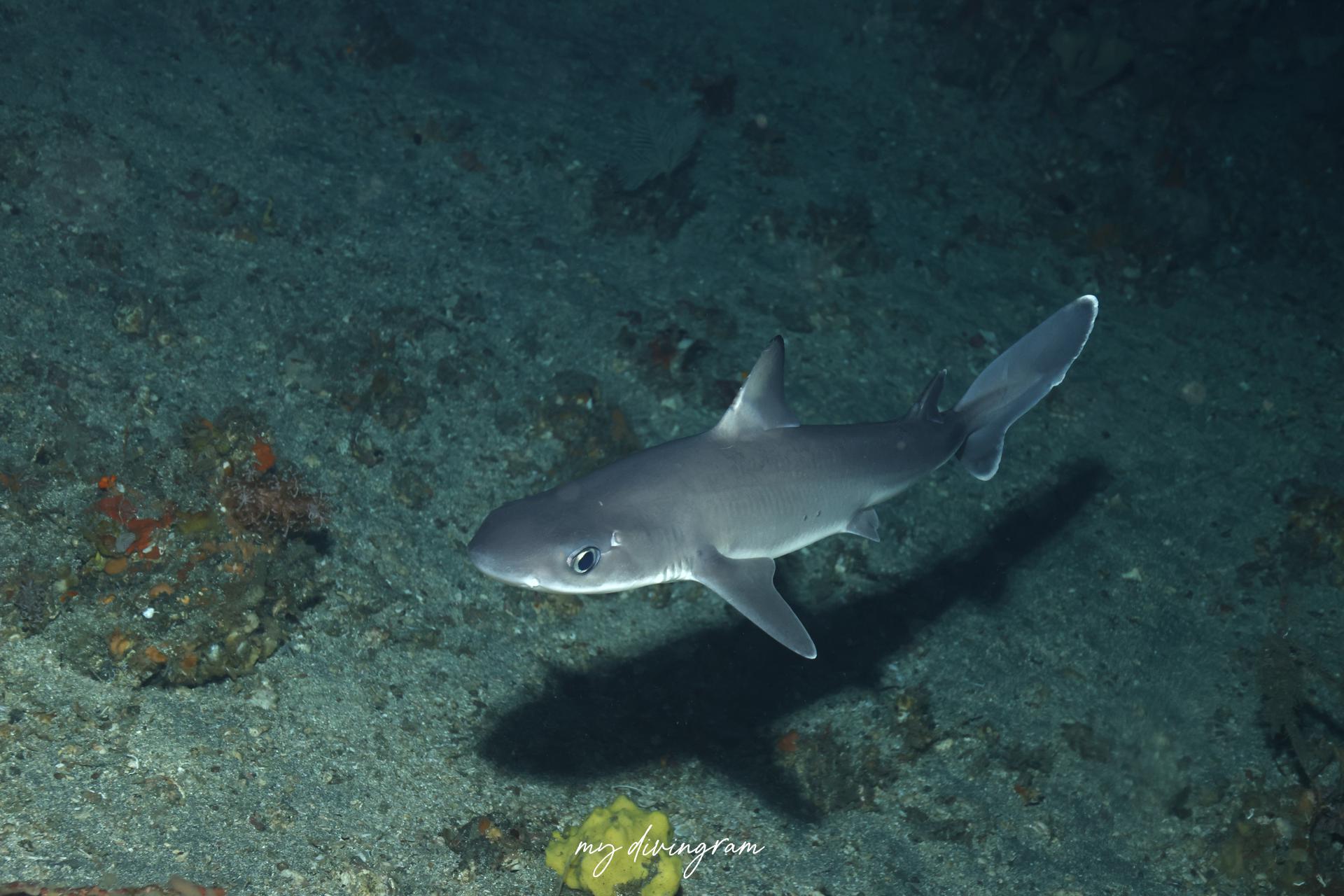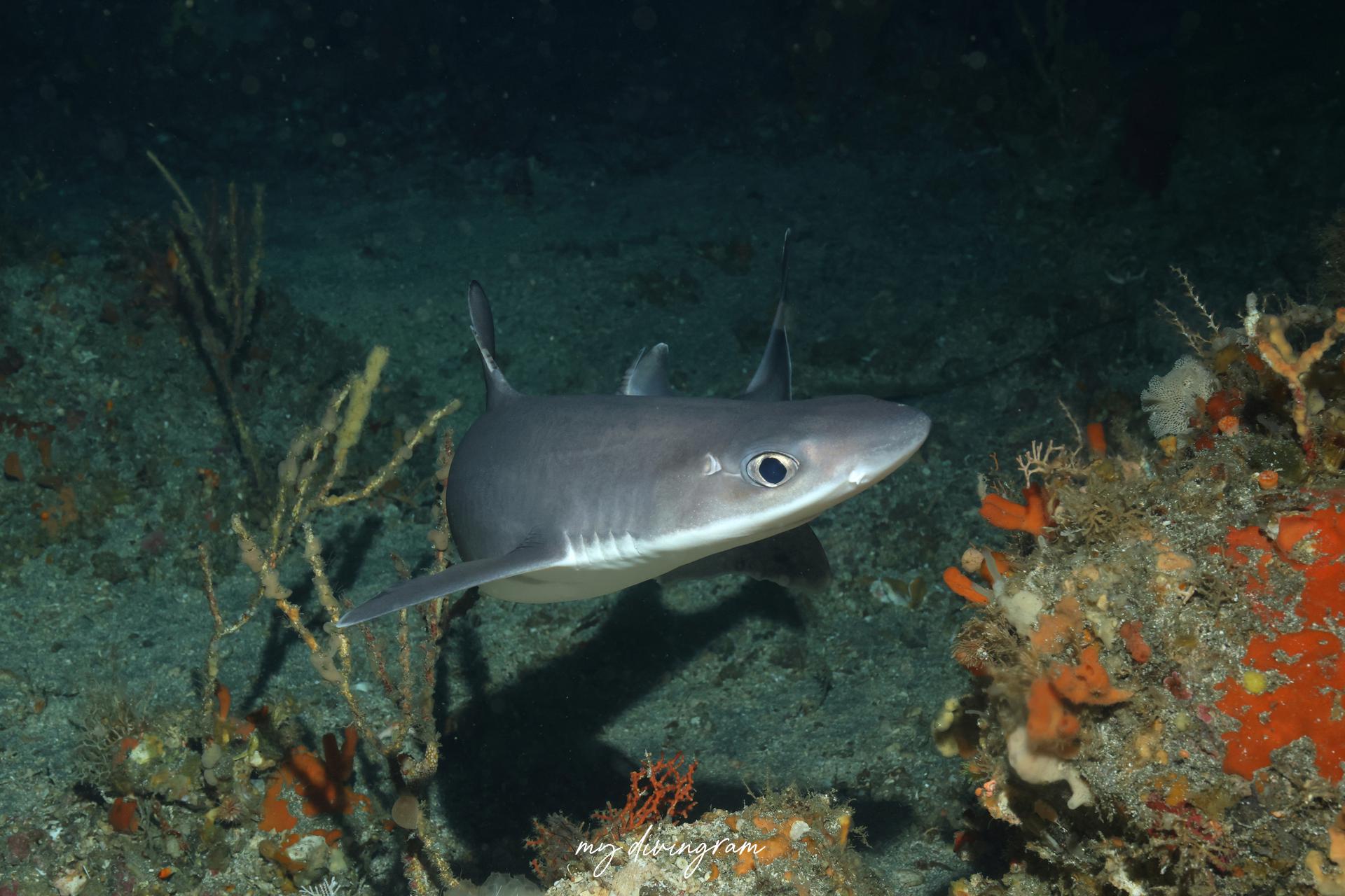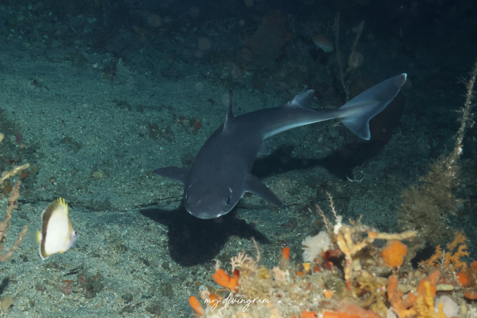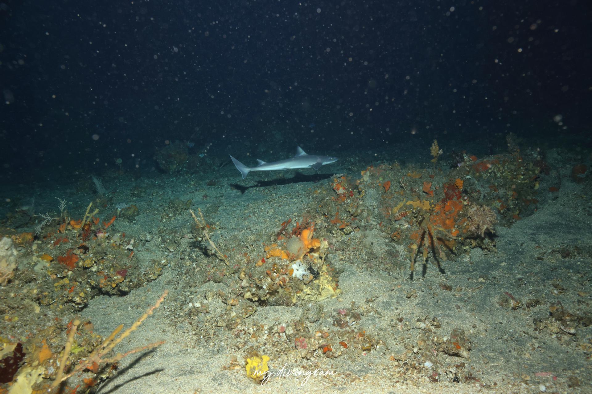 2025年の夏は目撃情報が増えており、ライトに寄ってくるのか、この日はどこで降りてもフトツノザメ3~4匹に巻かれました。