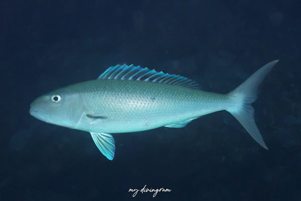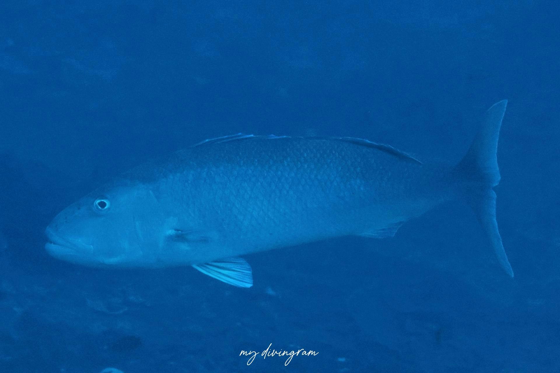 深場調査に行ったときにニラミハナダイくらいしか見つからなくて、八つ当たりで-20mくらいからずっとついてきていたアオチビキにカメラを向けました。