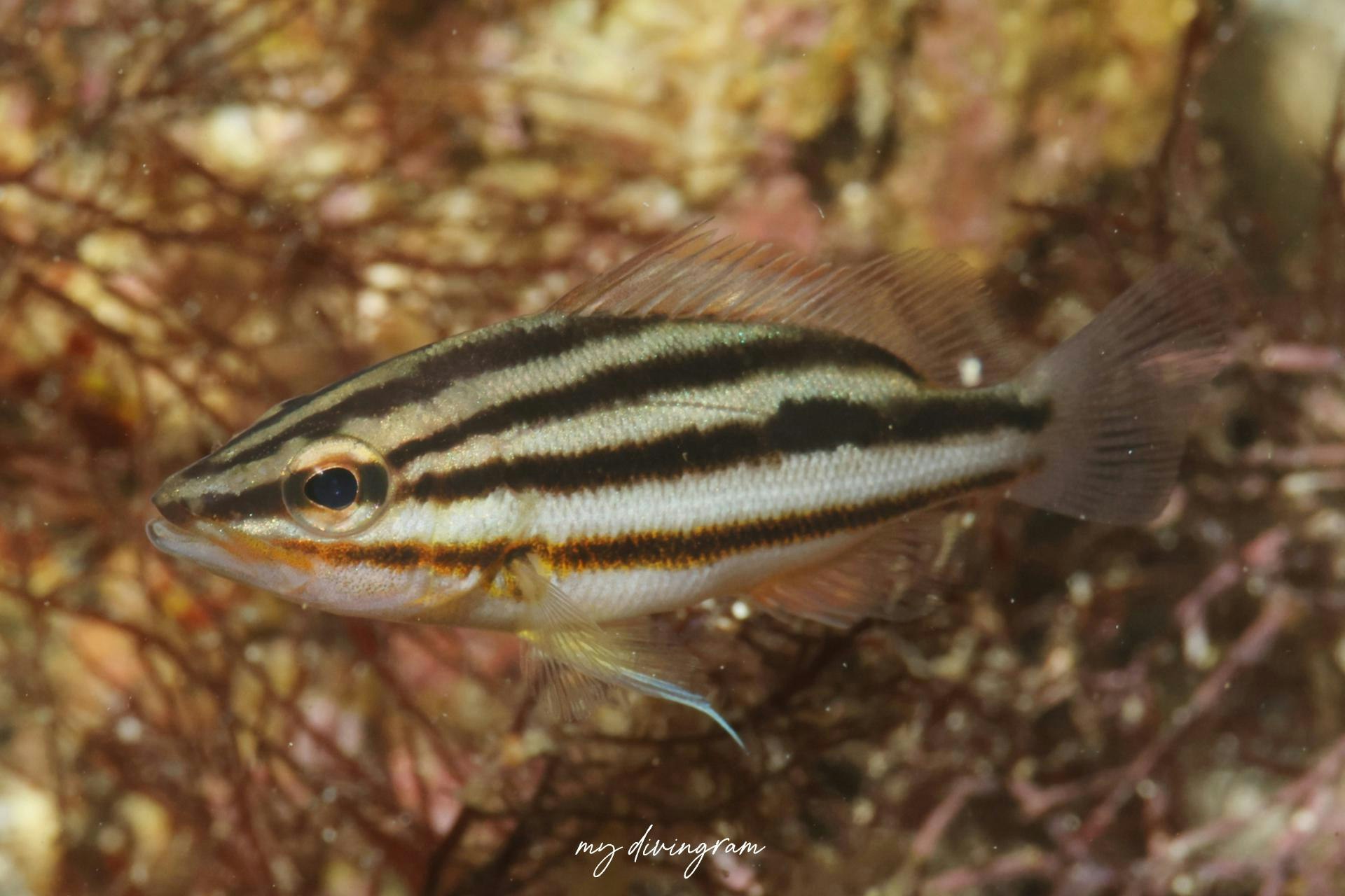 幼魚はシマシマの模様です。腹鰭もあまり黄色くありません。
