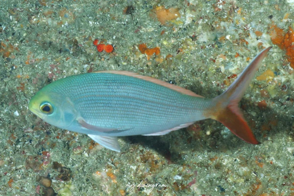 アオダイに似ていますが、体が青く尾鰭が赤いのが特徴です。