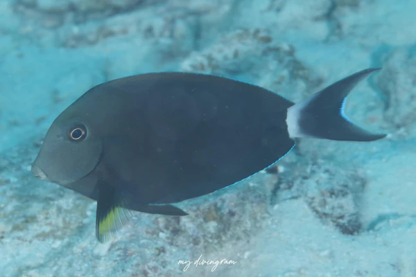 成魚は眼の後方に暗色斑があり、尾柄部の棘周辺にも細長い暗色斑があるのが特徴です。