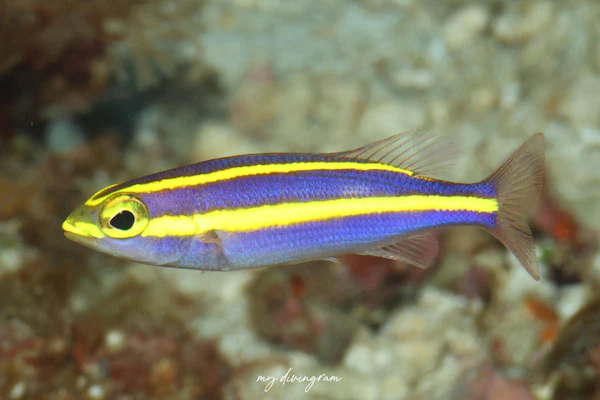 幼魚では左右の黄色縦帯がおでこで繋がってVになっているのが特徴です。