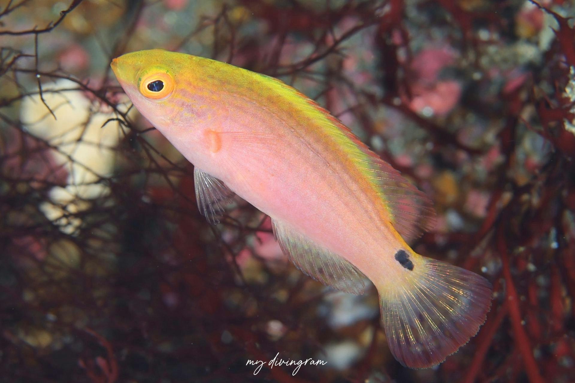 幼魚は体がピンク色で背中がレモン色、尾柄部に黒色斑があることが特徴です。