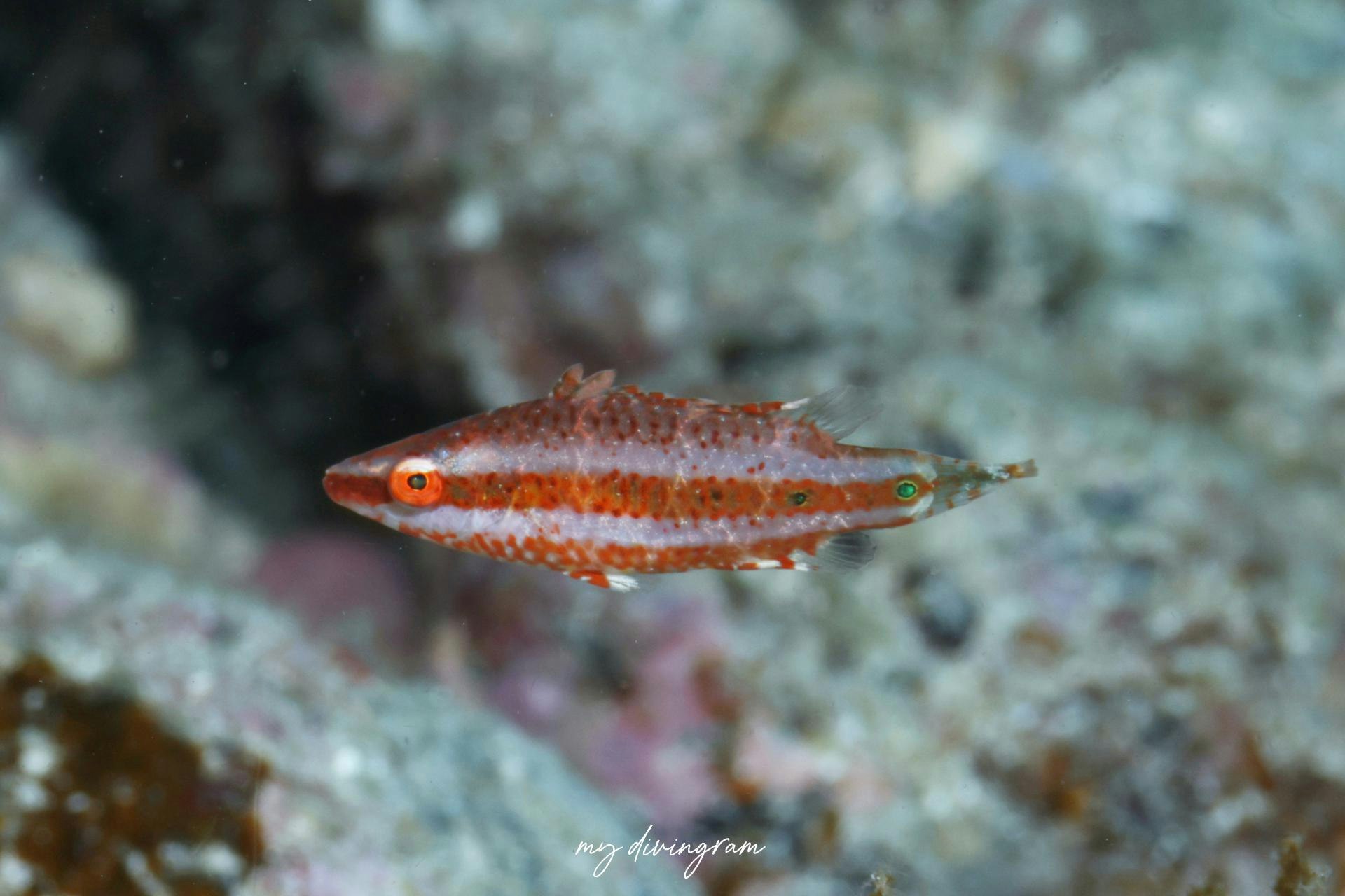 ヒトスジモチノウオとよく似ていますが、眼から後方に伸びるラインが鰓まで達しないのが特徴です。