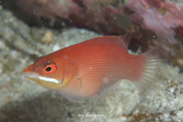 体側にはっきりとした縞模様がなく、眼の下に明るい水色のラインがあることで他のニセモチノウオ属と容易に見分けられます。