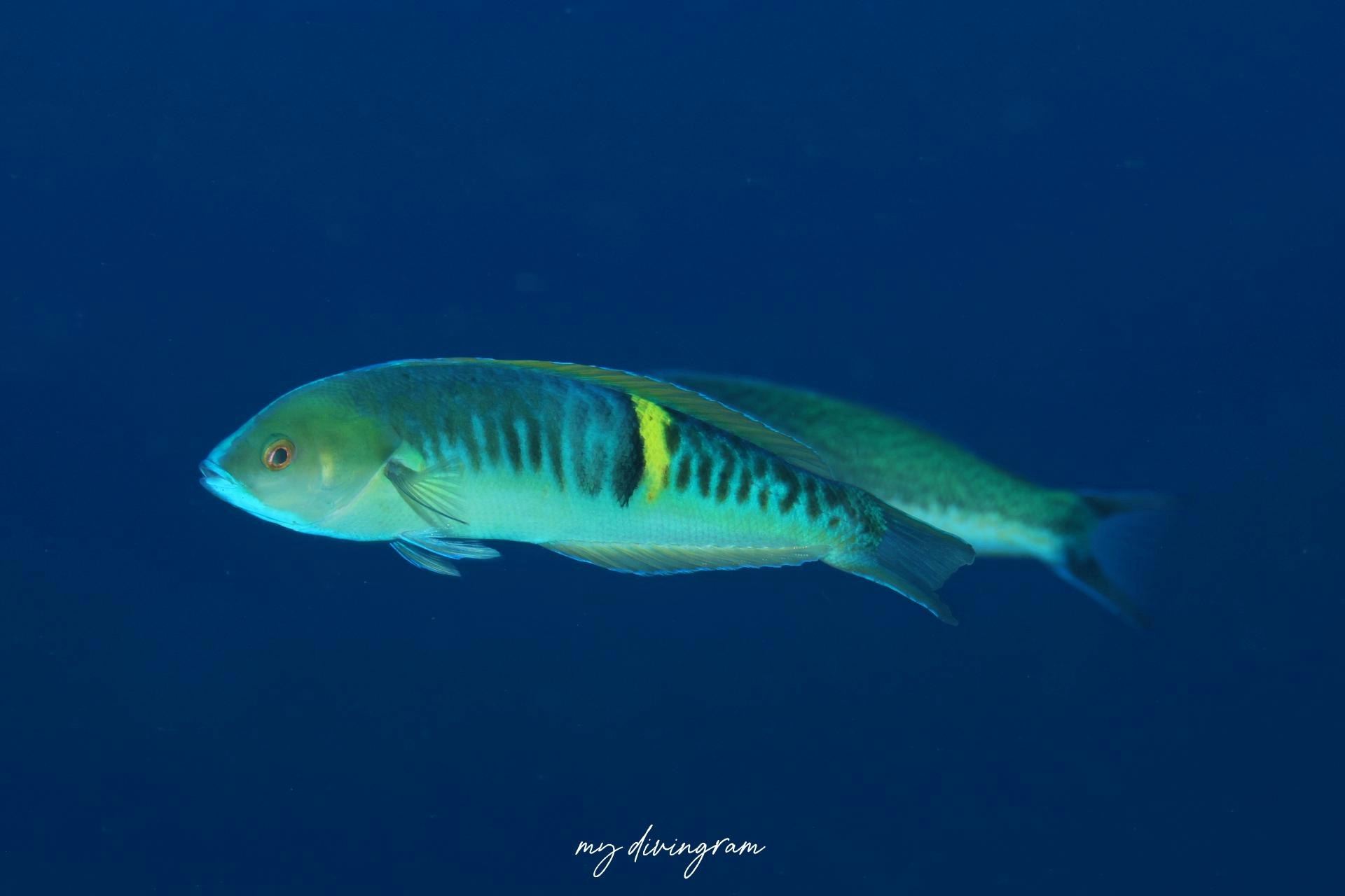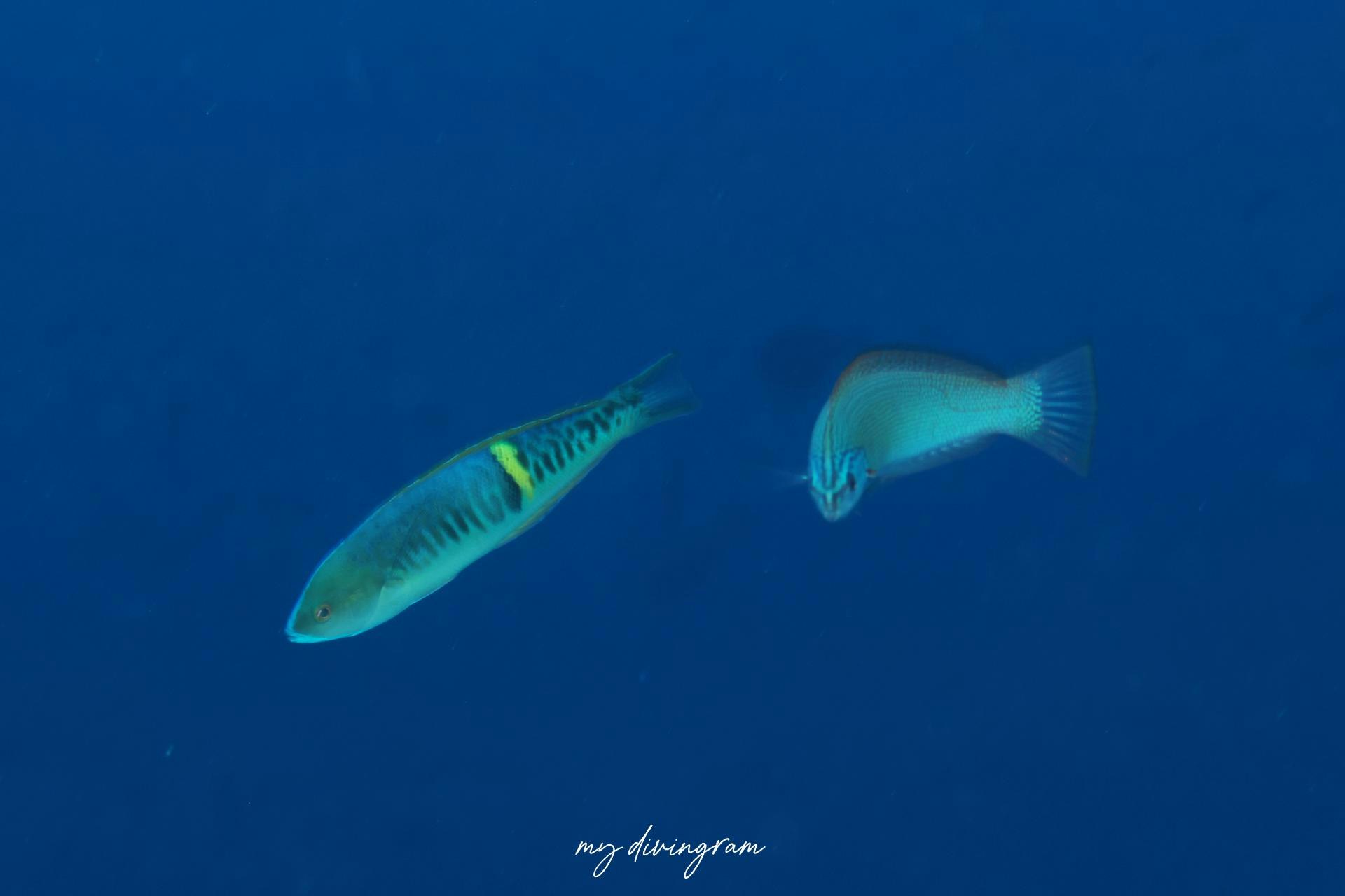シラタキベラのメスはヤマシロベラのメスとよく似ていますが、鰓蓋と尾鰭基部の両方に黒斑があることで見分けることができます。(尾鰭基部の黒斑はない個体もいるかもしれません…)