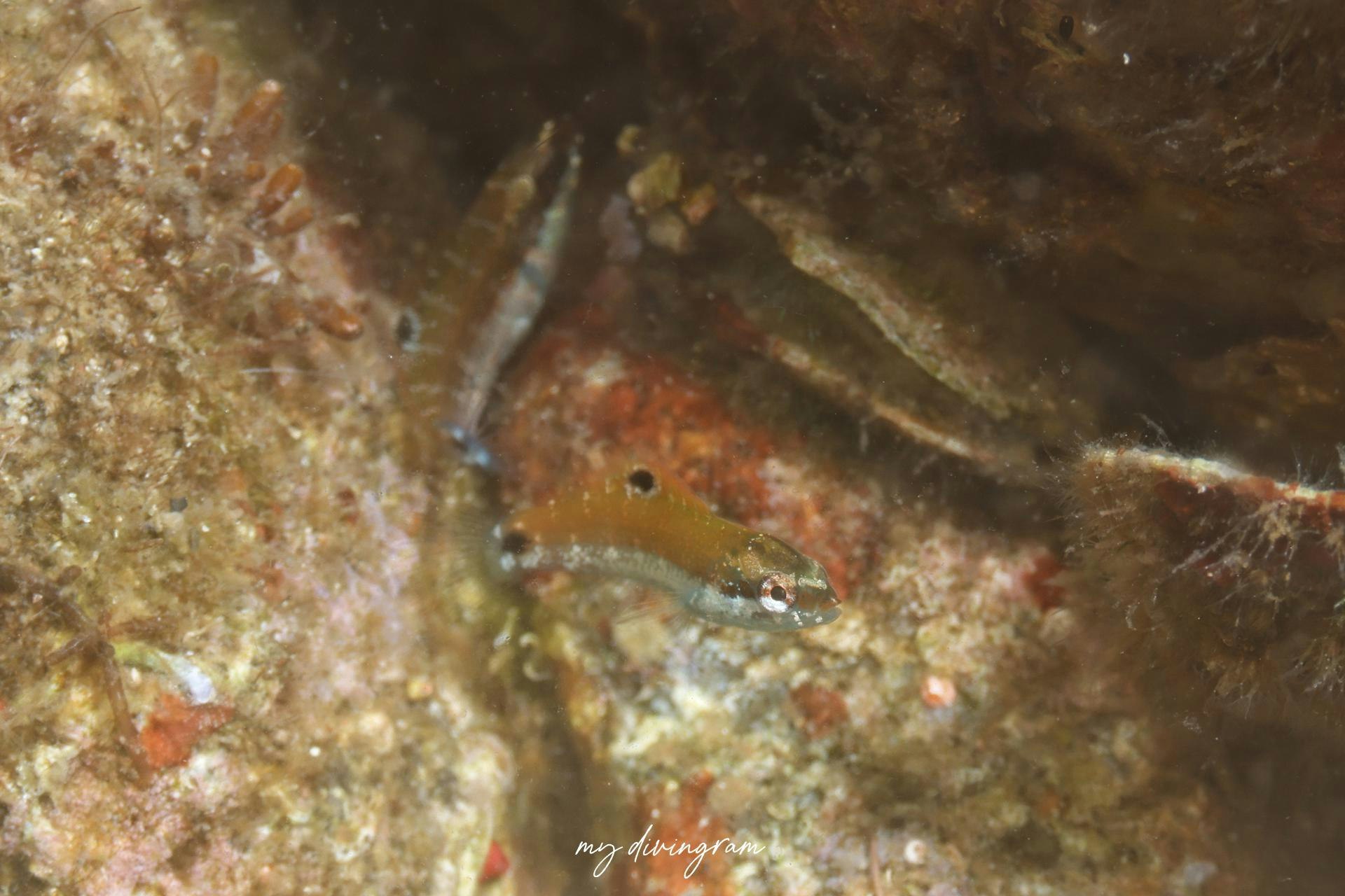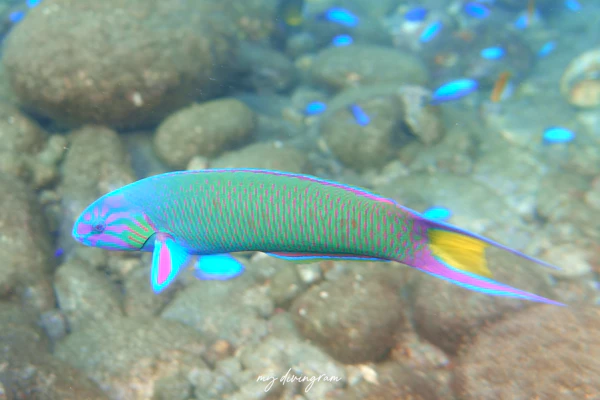 浅場でパタパタさせながら泳いでます。青い魚って貴重なので美しいです。