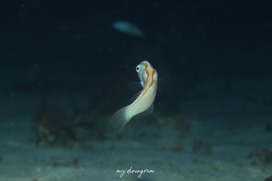 幼魚の頃は体色がピンク色で各鰭は黄色ですが、メスになると白い体色で背中に赤いラインが走ります。